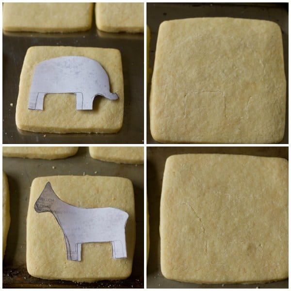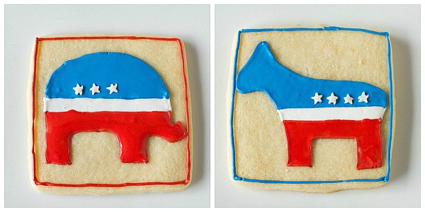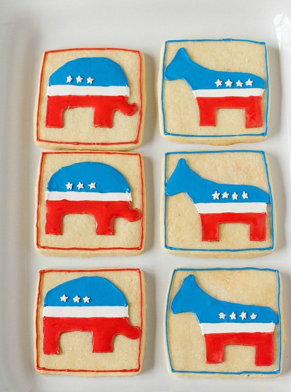 To make these cookies, I used my basic sugar cookie recipe and cut out large squares. To decorate, I found some images of the Republican elephant and Democratic donkey and scaled them down until they fit inside that square, cut them out and then traced around them on the cookie with a sharp paring knife. (Unfortunately, I found the actual cookie cutters online as I was looking for the images! I linked to them below since you may just want to get and use them.) From there I used royal icing to outline and flood the shapes, then put the finishing touch on with star sprinkles. (See “Resources” below for all of the recipes and products used.)