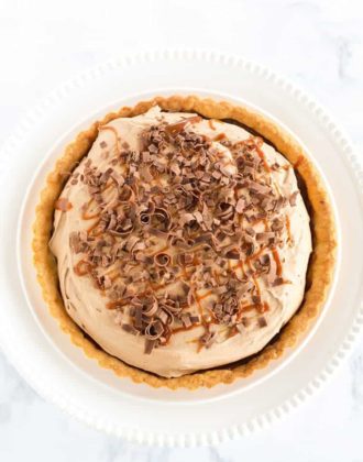 A pate sucree crust is filled with homemade caramel sauce and whipped milk chocolate ganache, then topped with a drizzle of caramel and milk chocolate curls.