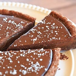 This tart… oh my gosh. Chocolate shortbread crust + homemade salted caramel sauce + chocolate ganache + fleur de sel. That all adds up to one heck of a dessert! I’ve had this recipe...