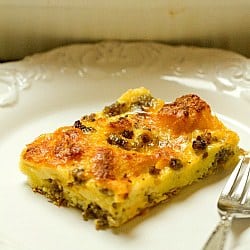 As promised yesterday, I bring you another breakfast casserole today. This one is more of the savory variety, with a heavy dose of sausage and cheese. Puffed pieces of bread, set with eggs, and...