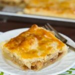 Roll the second piece of dough (the smaller one, if they were different sizes) into a 16x11-inch rectangle. Drape over the filling and fold the bottom crust’s overhang over the edges, sealing the two pieces of dough together. Crimp the edges, if desired. Using a paring knife, cut nine small slits over the surface of the top crust.