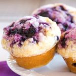 Divide the batter equally among the prepared muffin cups (the batter should completely fill the cups and mound slightly). Spoon 1 teaspoon of the cooked blueberry mixture into the center of each mound of batter. Using a skewer, gently swirl the filling into the batter using a figure-eight motion. Sprinkle the sugar evenly over muffins.