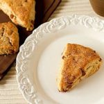 Transfer dough to a floured countertop and knead dough by hand just until it forms a ball. Form scones by patting the dough into a ¾-inch thick circle. Cut the scones into triangles or use a biscuit cutter for round scones.