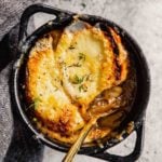 Bubbling gruyere cheese and crispy baguette top a brothy base full of perfectly braised onions in this showstopping French onion soup recipe. Whether you're making it to warm up on a cold day or for a delicious date night in, this feels luxurious and cozy each and every time.