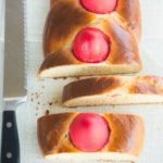 Transfer the baking sheets to the oven and bake for 10 minutes. Remove one baking sheet from the oven. Quickly and carefully push 5 eggs, larger side down, into the center of the loaf, spacing them evenly down the length. Brush the dough with the egg wash and immediately return to the oven. Repeat with the second loaf.