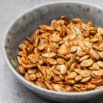 Spread in a single layer on the baking sheet and bake until the seeds are golden and crunchy, about 20 minutes, stirring halfway through. Allow the seeds to cool for at least 15 minutes before serving.