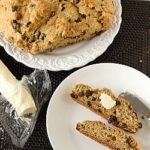 In a large bowl, whisk together the flours, baking soda, and salt. Use a pastry blender or your finger tips to blend the butter into the flour mixture until coarse crumbs are formed. Most of the butter should be about the size of small peas, with a few larger pieces throughout. Stir in the whiskey-soaked raisins. With a wooden spoon, stir in the buttermilk just until the dry ingredients are moistened and the dough comes together.