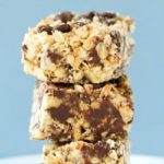Immediately pour the hot mixture (carefully!) over the oatmeal mixture and quickly stir to combine, ensuring that all of the oatmeal mixture has been moistened. Turn the mixture into the parchment-lined pan and use the back of a spoon to press it evenly into the pan. Sprinkle the remaining 1 cup of chocolate chips over top and gently press them into the top of the mixture.