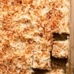 Spread the frosting over the cake, then top with the toasted coconut flakes.