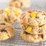 Reduce the mixer speed to low and slowly add the flour mixture to the wet ingredients and mix until just combined. Using a rubber spatula, stir in the oats, chocolate chips, peanut butter chips, and Reese's Pieces candies by hand.
