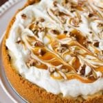 Garnish and Serve the Pie: Remove the sides of the springform pan. Spread the whipped cream evenly over the top of the cheesecake layer. Dollop spoonfuls of the caramel sauce on top of the whipped cream and, using a butter knife or offset spatula, gently swirl the caramel into the whipped cream. Sprinkle additional chopped pecans on top. Serve immediately. Cover and refrigerate any leftovers.