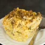 Layer ⅓ of the hashbrowns on the bottom, then season with salt and pepper. Top with ⅓ of the cooked sausage, then ⅓ each of the green onions and cheddar cheese. Repeat the layers two more times, ending with the cheese.